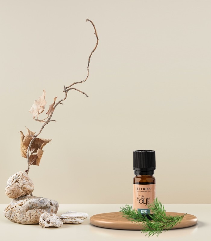 Eterično olje bora je znano po svoji sveži, lesni aromi, ki prebuja energijo in čisti zrak. Primerno je za osvežitev prostora in krepitev telesne ter duševne energije.